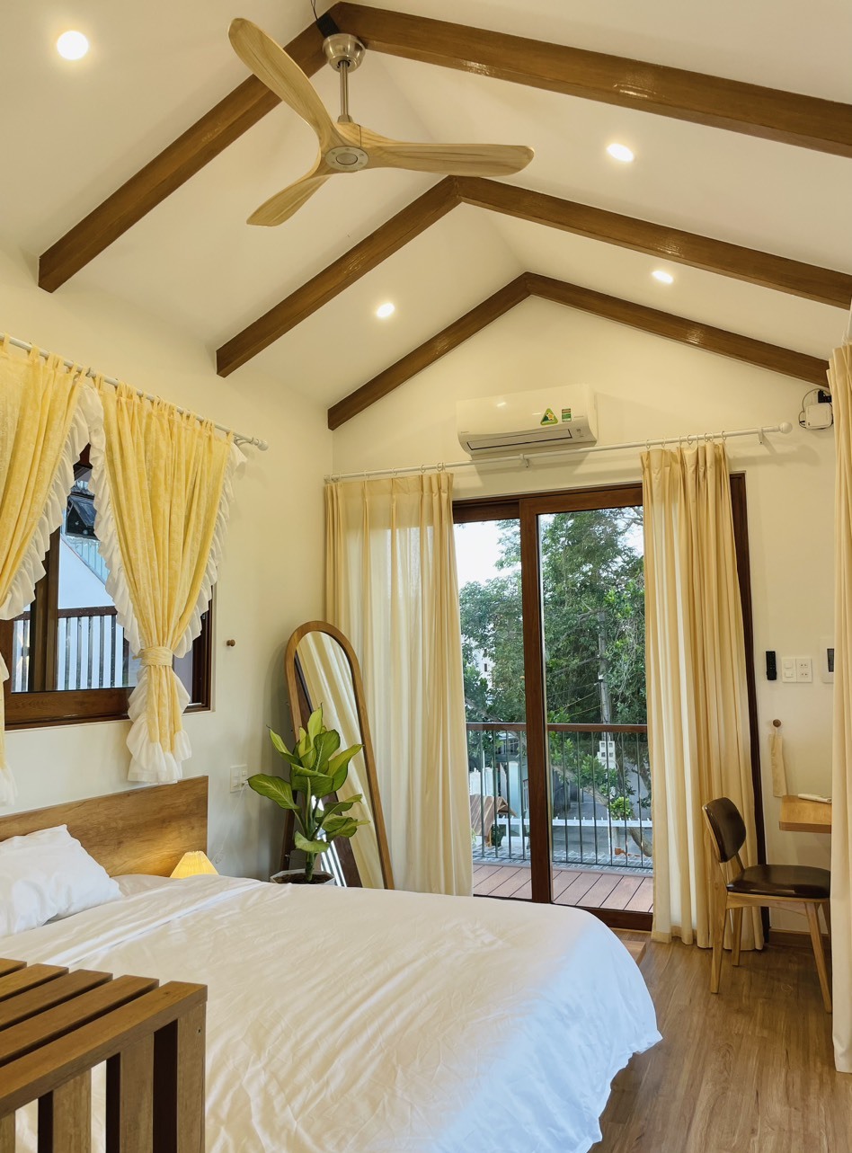 Trần của các phòng ngủ đều có dạng mái vòm với các thanh xà bằng sắt, bọc gỗ nổi bên ngoài, tạo cảm giác chắc chắn, rộng rãi.