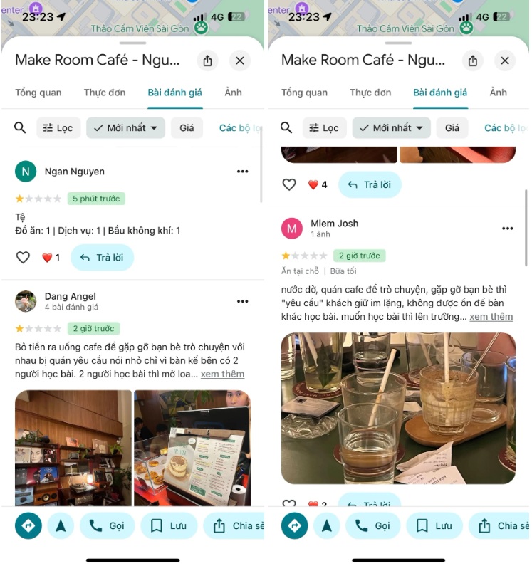 “Các tài khoản đều lập mới như spam nên quán không che tên. Việc đánh giá tiêu cực ảnh hưởng rất nhiều đến hoạt động của quán vì chúng tôi còn mới, khách hàng thường tìm đến quán qua Google”, anh Tài nói.