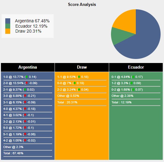 Với các tỷ số có khả năng xảy ra, đội chủ nhà Argentina thắng lợi 1-0 đạt 13,77%. Đội chủ nhà và đội khách hoà 1-1 đạt 9,53%. Đội khách Ecuador có 4,84% đánh bại Argentina 1-0.