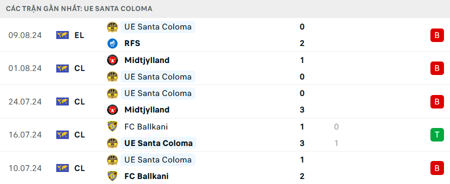 Bên kia sân, Santa Coloma chìm sâu trong cơn khủng hoảng về phong độ. Nên biết, Santa Coloma thua tới 4/5 trận đấu đã đá ở mùa giải năm nay. Với phong độ hiện tại và thêm bất lợi sân bãi, Santa Coloma sẽ thêm một lần thất bại và không đem tới cảm giác an toàn cho các nhà đầu tư.