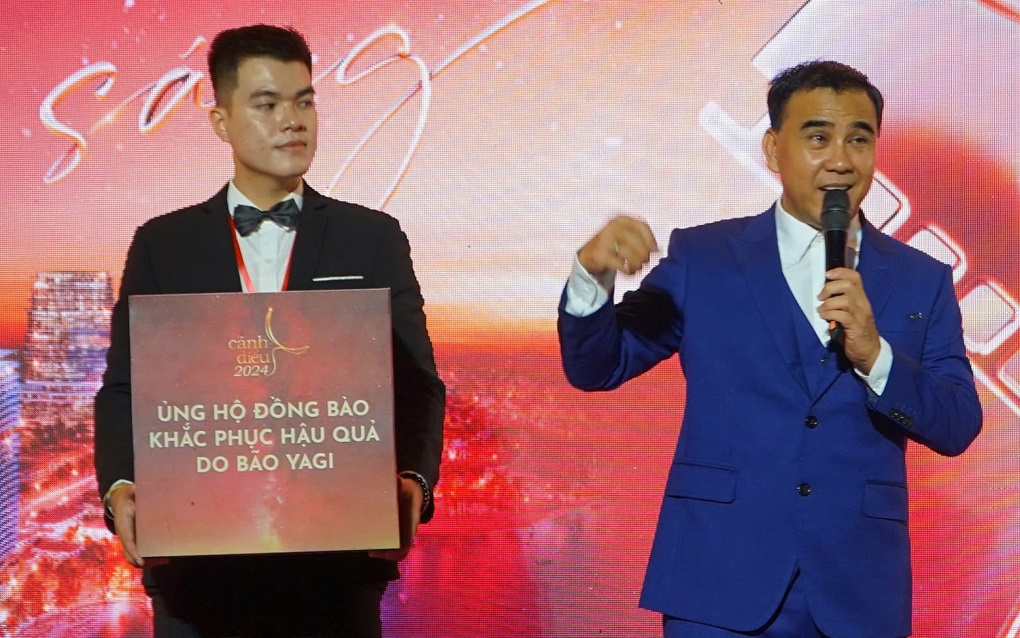 Quyền Linh đại diện đoàn phim "Hai Muối" ủng hộ người dân khắc phục hậu quả sau bão. (Ảnh: BT)