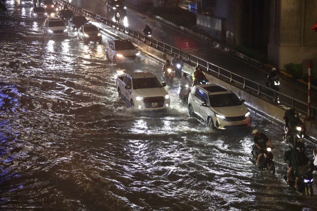 Đường Nguyễn Trãi đoạn dưới chân ga tàu điện vành đai 3 ngập kéo dài 500 m, nhiều phương tiện phải di chuyển chậm. Mưa lớn cũng gây tắc đường, ghi nhận 21h hàng dài phương tiện nối đuôi đi qua đoạn ngập kéo dài hơn một km.