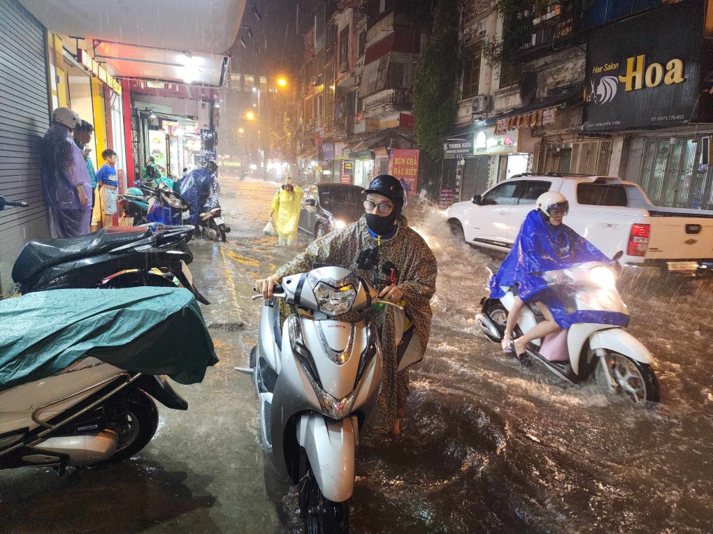 Từ 19h, Hà Nội đổ mưa lớn, lượng mưa đo được lớn nhất tại quận Ba Đình và Hai Bà Trưng hơn 70 mm, trong khi Đống Đa, Hoàn Kiếm đều trên 60 mm.