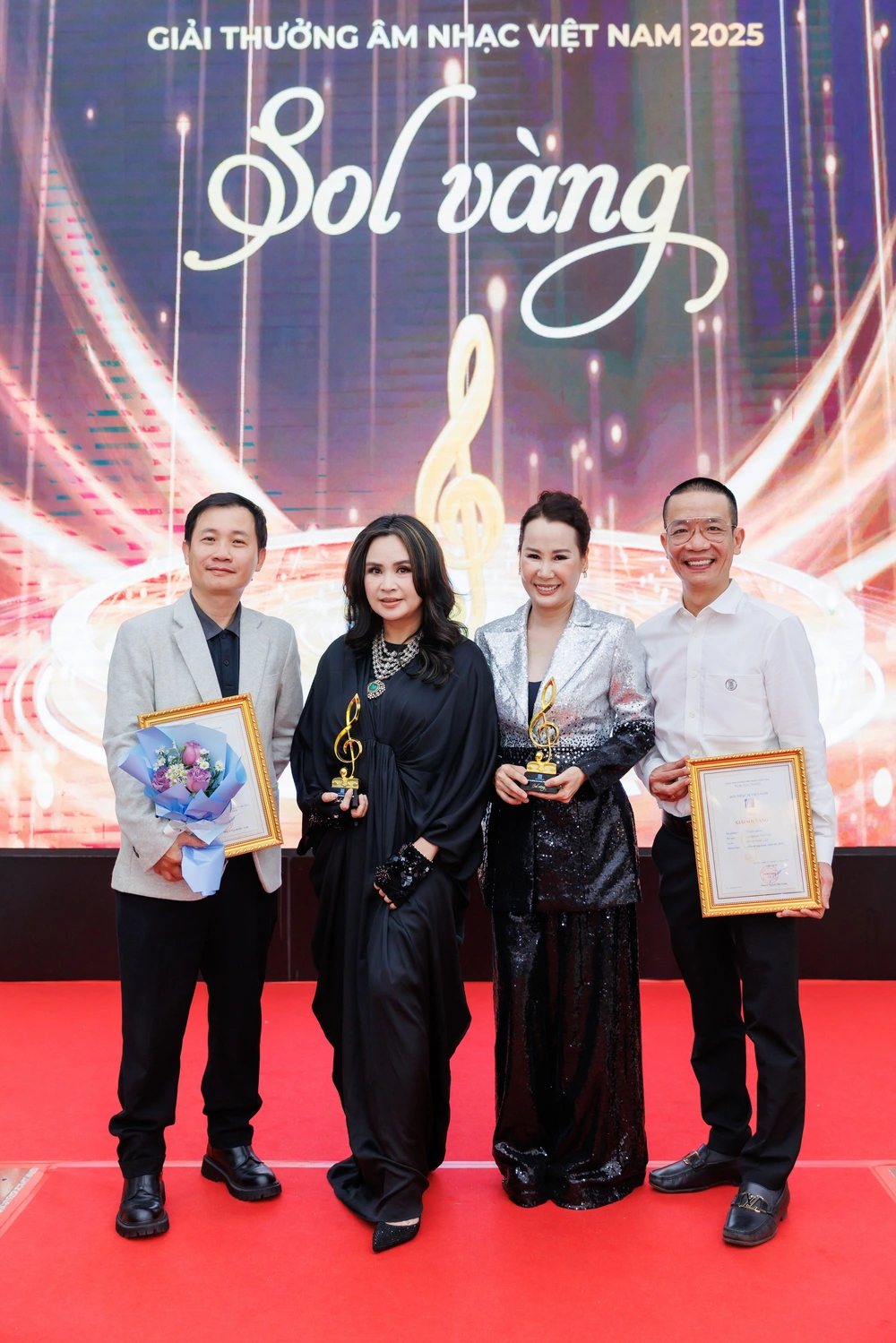 Từ phải qua: Nhạc sĩ Nguyễn Quang Long, NSND Thanh Lam, nhạc sĩ Giáng Son và Nguyễn Vĩnh Tiến tại Lễ trao giải. Ảnh: Nguyễn Hoàng Long
