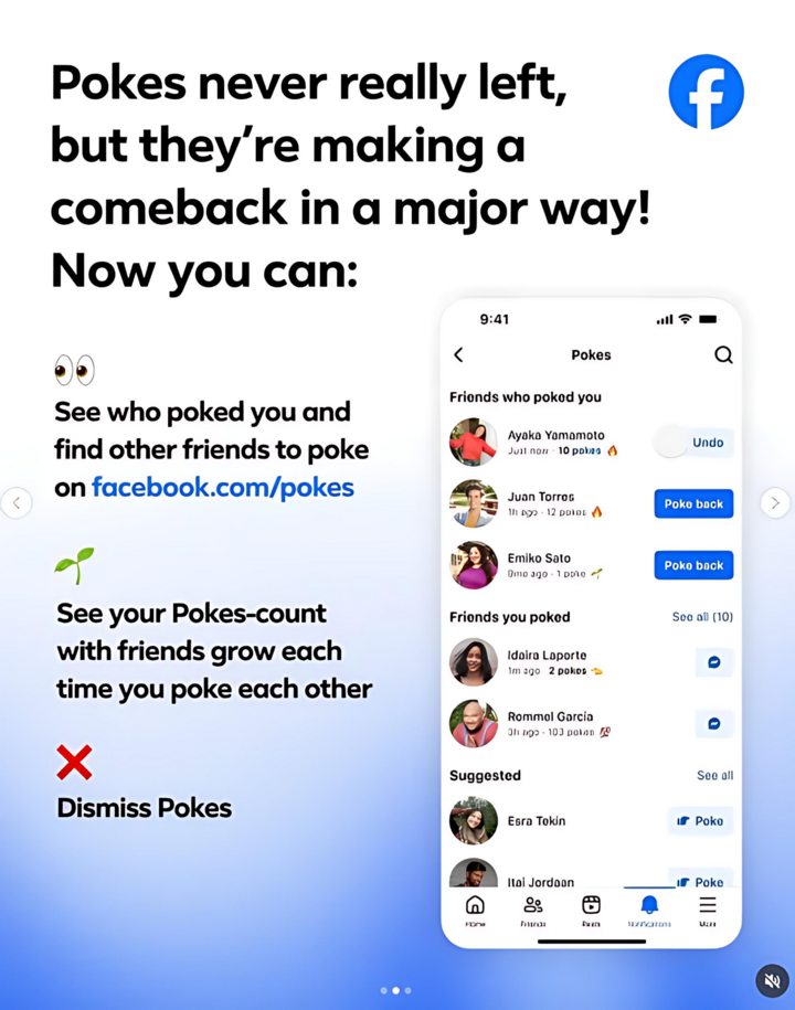 Meta đang nỗ lực đưa tính năng "poke" (gây chú ý) trở lại thời hoàng kim trên Facebook. Dù chưa từng biến mất hoàn toàn, "poke" từng là cách người dùng tạo sự chú ý với bạn bè. Giờ đây, Facebook bổ sung nút poke trực tiếp trên hồ sơ cá nhân, cho phép người dùng theo dõi số lần poke qua trang facebook.com/pokes.