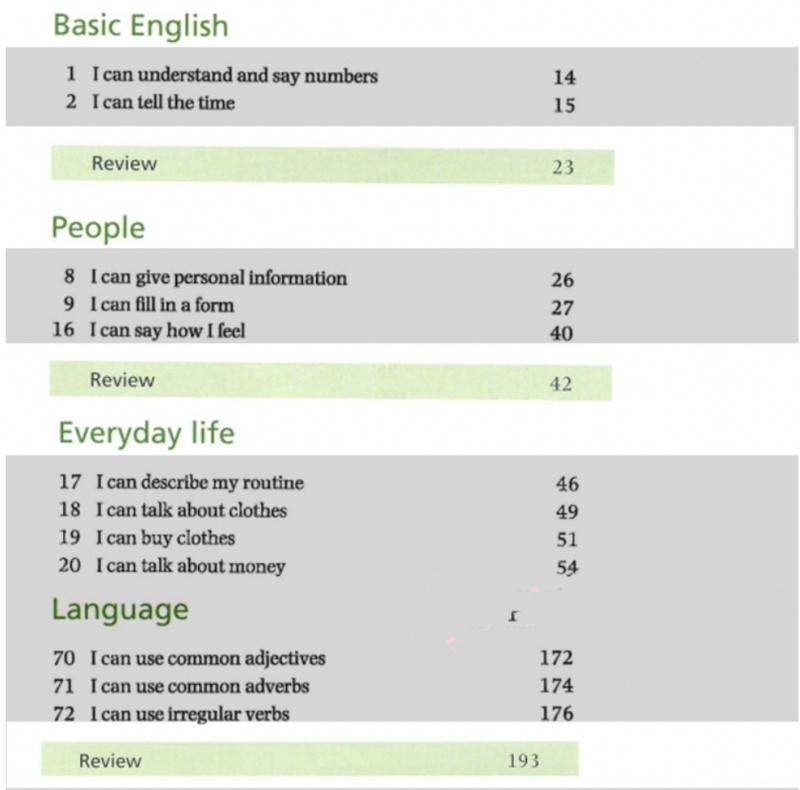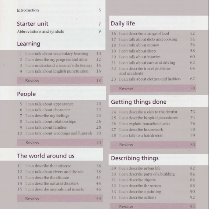 Các chủ điểm được phân bổ: Learning (Học tập), People (Con người), The world around us (Thế giới xung quanh chúng ta), Daily life (Cuộc sống hàng ngày), Describing things (Miêu tả sự vật), Social and political issues (Các vấn đề xã hội và chính trị), Media and entertainment (Truyền thông và giải trí),…