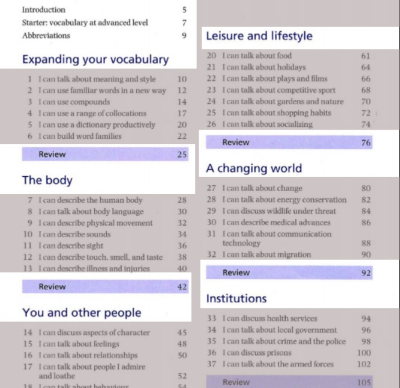 Chủ đề từ vựng: Các chủ đề từ vựng nâng cao, tập trung vào các vấn đề khác nhau trong tiếng Anh và trong giao tiếp hàng ngày, ví dụ như: The body (Cơ thể), You and other people (Bạn và những người khác), Leisure and Lifestyle (Giải trí và Lối sống), Institutions (Thể chế),… Đặc biệt, thông qua các từ vựng này người học dễ dàng nâng cao trình độ Speaking.