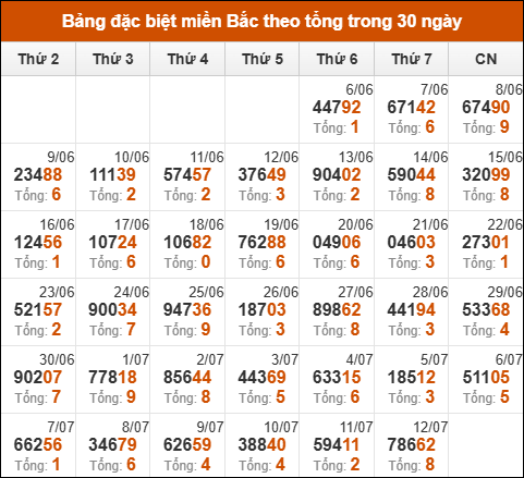 Thống kê GĐB xổ số miền Bắc theo tổng trong 30 ngày tính đến 13/07/2025