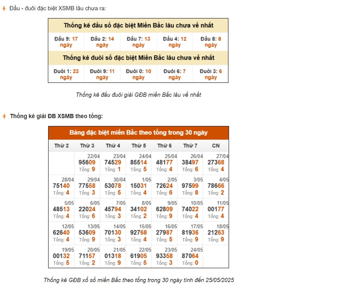 - Thống kê 2 số cuối giải đặc biệt XSMB ngày 25/05/2025