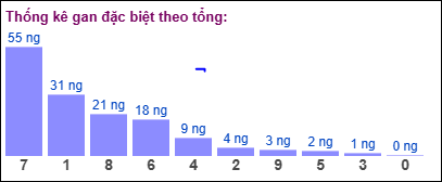 ⇒ Từ thống kê trên, ta thấy được tổng 7 gan nhất đã 55 ngày chưa xuất hiện, (bao gồm 10 cặp số: 07, 16, 25, 34, 43, 52, 61, 70, 89, 98)