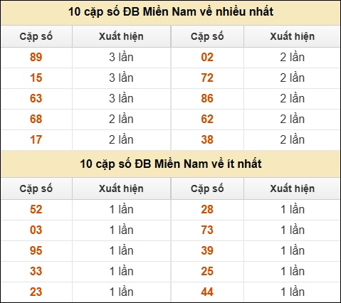 ⚡ 10 cặp số ĐB Miền Nam về nhiều nhất/ ít nhất tính đến ngày 15/07/2025:
