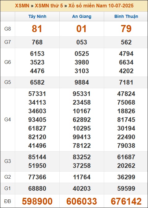 Kết quả xổ số Miền Nam 10/07/2025 thứ 5 tuần trước
