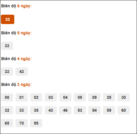 Đuôi 5: 5 ngày, Đuôi 6: 4 ngày, Đuôi 8: 2 ngày, Đuôi 9: 2 ngày, Đuôi 1: 1 ngày