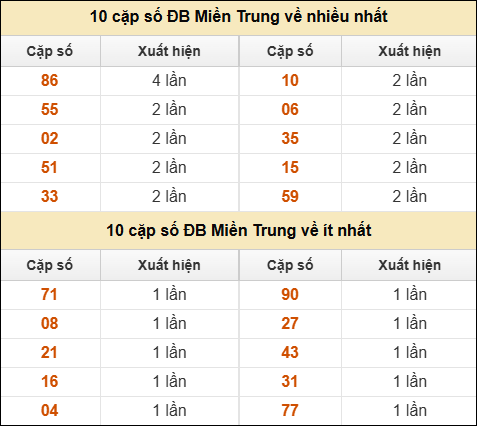 ⚡ 10 cặp số ĐB XSMT về nhiều nhất/ ít nhất tính đến ngày 17/7/2025: