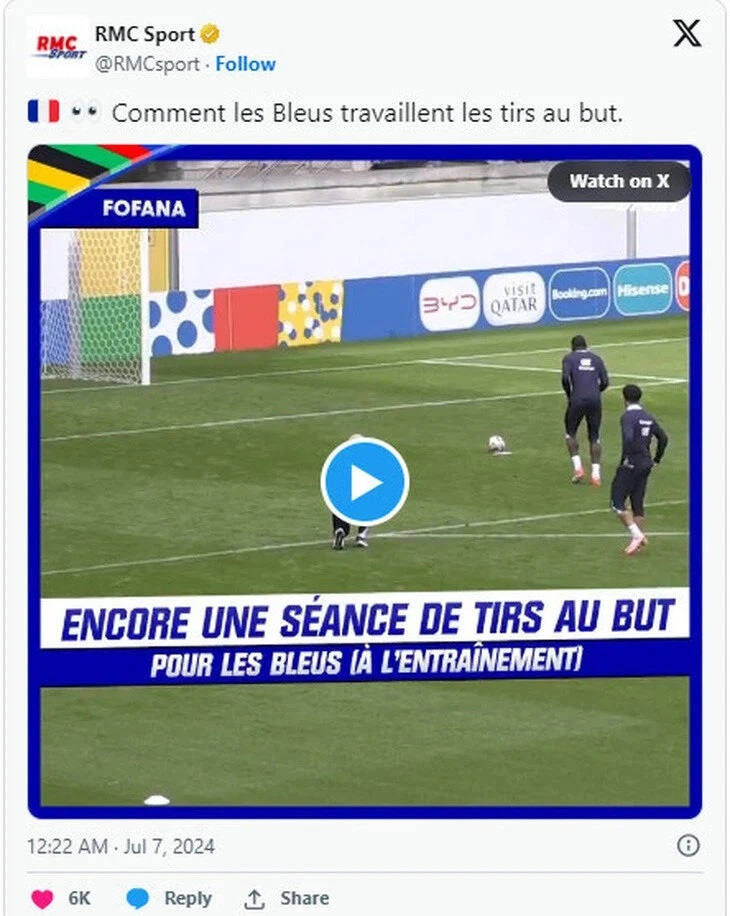 Mới đây, kênh truyền hình RMC Sport của Pháp đăng một video về buổi tập đá phạt đền của đội tuyển Pháp chuẩn bị cho trận gặp Tây Ban Nha lên mạng xã hội X (trước đây là Twitter), đồng thời hiển thị tên của từng cầu thủ thực hiện cú sút trên màn hình.