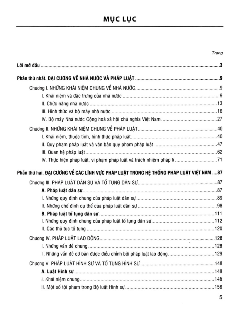 - Phần thứ nhất: Đại cương về nhà nước và pháp luật, gồm những khái niệm và lí luận chung về nhà nước, pháp luật.