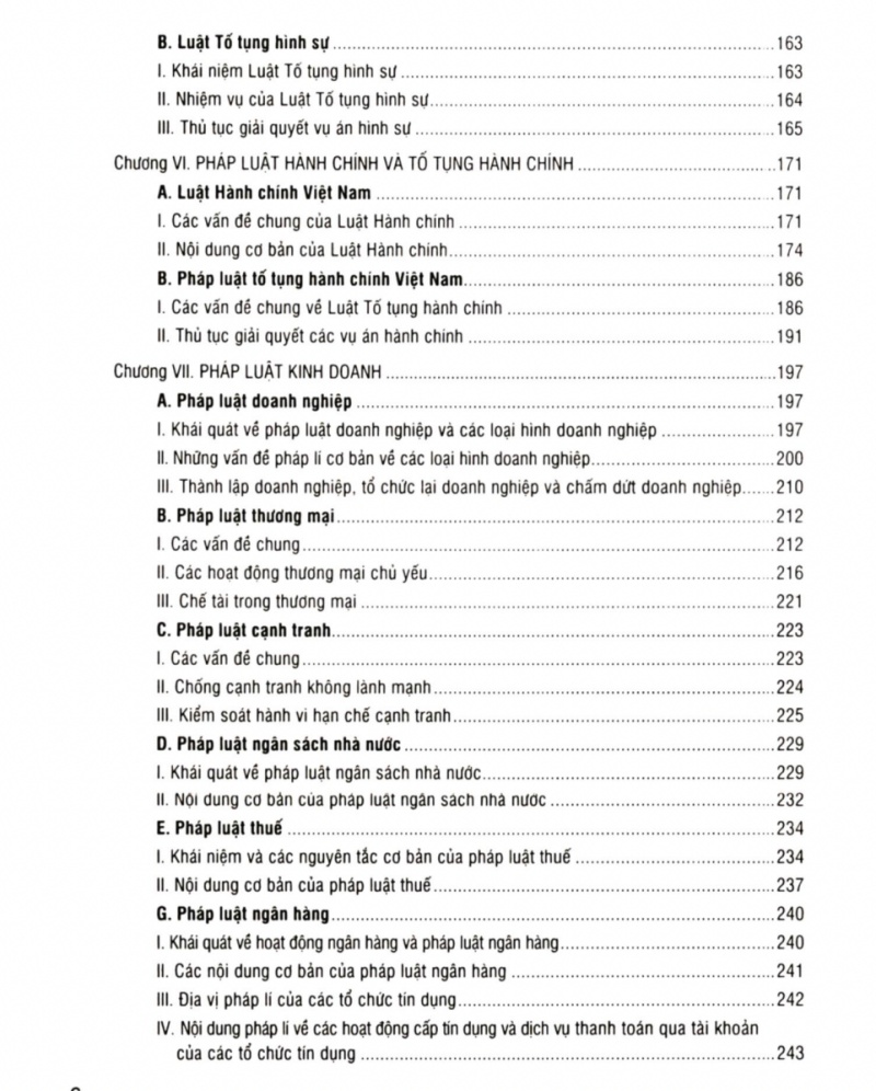 - Phần thứ hai: Đại cương về các lĩnh vực pháp luật trong hệ thống pháp luật Việt Nam, gồm các lĩnh vực: pháp luật dân sự và tố tụng dân sự, pháp luật lao động, pháp luật hình sự và tố tụng hình sự, pháp luật hành chính và tố tụng hành chính, pháp luật kinh doanh, pháp luật đất đai, môi trường.