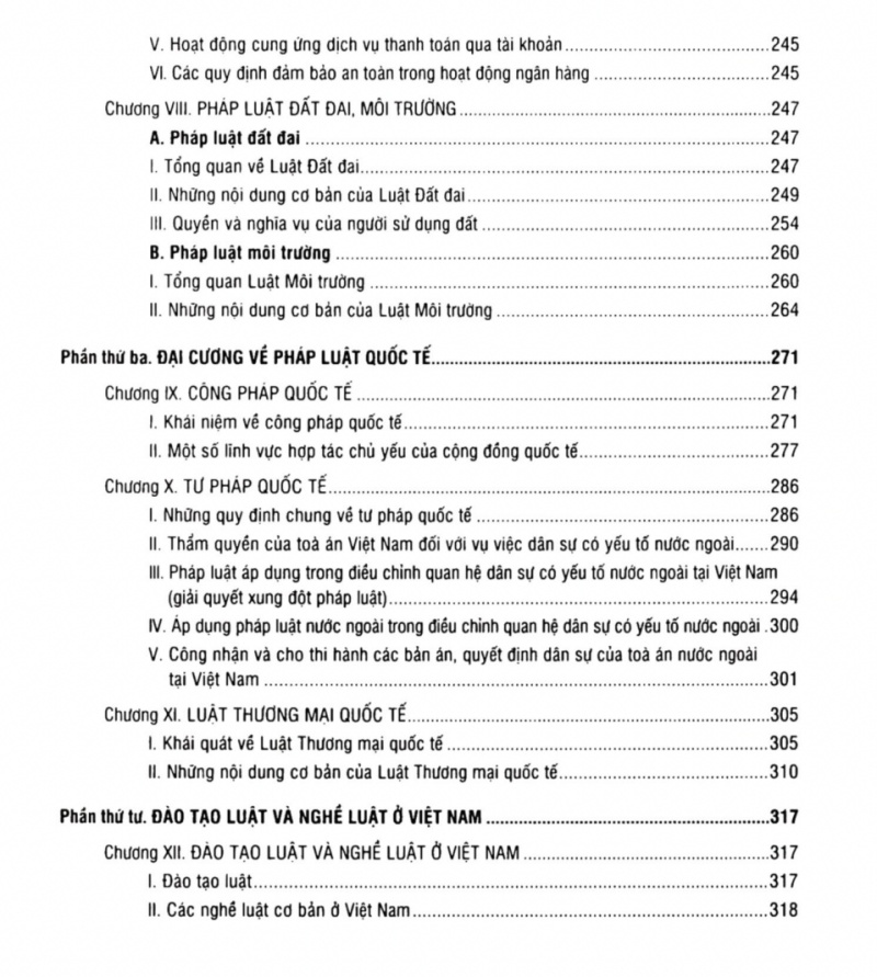 - Phần thứ ba: Đại cương về pháp luật quốc tế, gồm những kiến thức chung về công pháp quốc tế, tư pháp quốc tế, luật thương mại quốc tế.