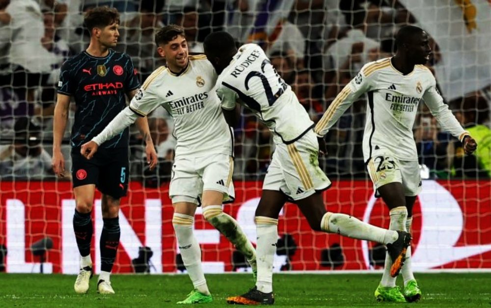 Man City giữ bóng tới 63% thời lượng hiệp một, nhưng Real mới tạo ra nhiều cơ hội hơn. Chủ nhà dẫn ngược trong vòng hai phút, từ những cú sút đập hậu vệ đổi hướng. Phút 12, Eduardo Camavinga sút xa sượt qua đùi trung vệ Ruben Dias, bay ngược hướng di chuyển của thủ môn Stefan Ortega. Bàn này được tính là Dias phản lưới, vì cú đá của Camavinga hướng chệch cầu môn.