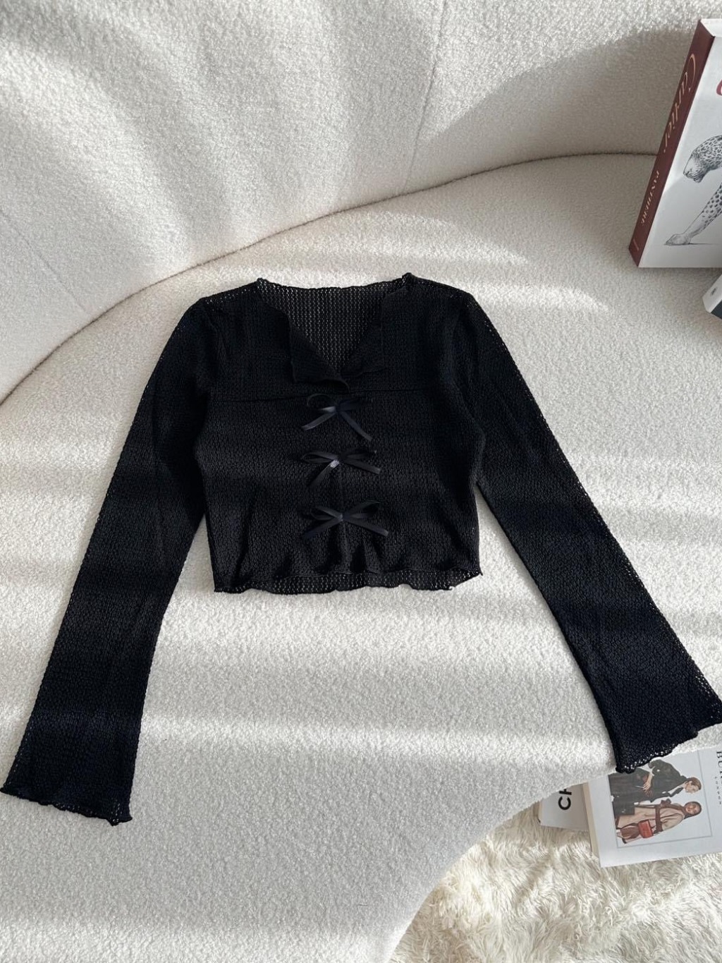 Áo thun lưới phối nơ giữa tay dài loe cổ tim là kiểu áo thun phổ biến trong thời trang đương đại.