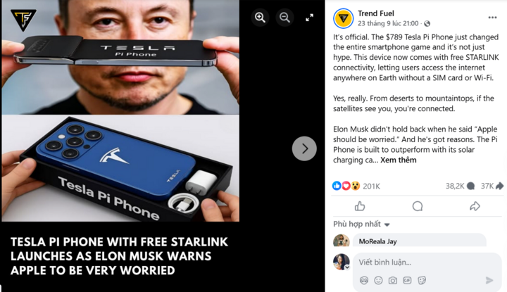 Không lâu sau khi iPhone 17 ra mắt, tài khoản Facebook Trend Fuel bất ngờ đưa tin về Tesla ra mắt điện thoại sẽ thay đổi hoàn toàn cuộc chơi smartphone và "Apple nên lo lắng".