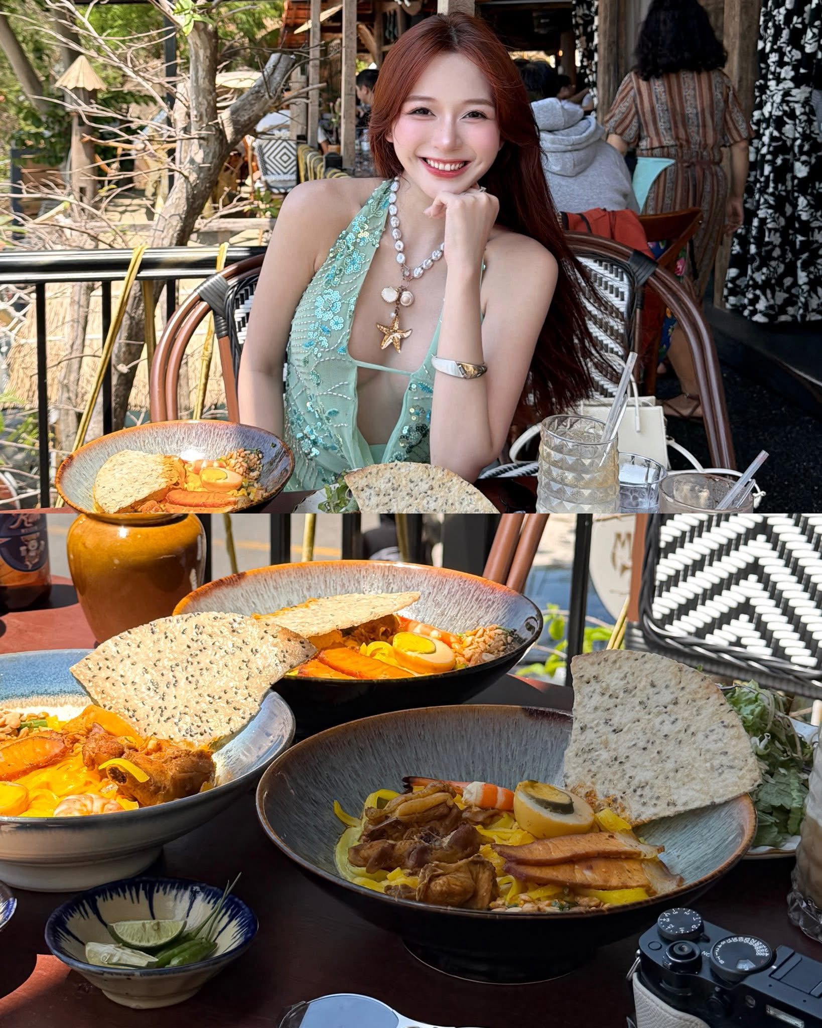 Dù là khi đang thưởng thức ẩm thực hay lúc thả dáng bên khung cửa gỗ, Karty Chang đều giữ được phong thái tự tin, sang chảnh. Màu tóc nâu đỏ rực rỡ dưới nắng càng làm nổi bật tông da và tạo nên vẻ ngoài vừa trẻ trung, vừa cá tính.