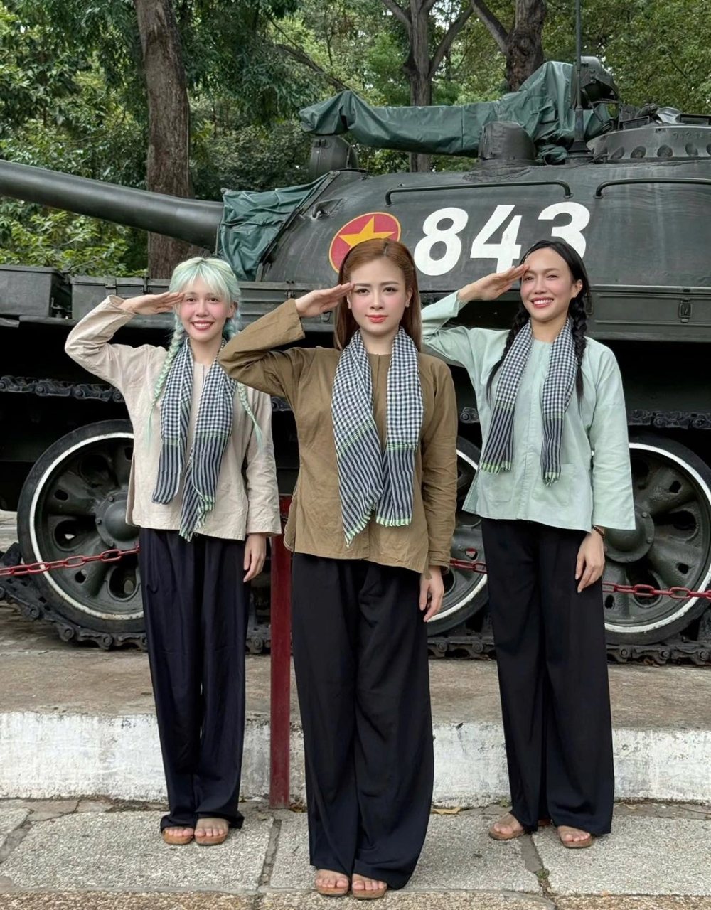 Hậu Hoàng, Dương Hoàng Yến và Diệu Nhi cùng nhau diện trang phục áo bà ba kèm khăn rằn, khoe bộ ảnh đặc biệt trong dịp kỷ niệm 50 năm Ngày Giải phóng miền Nam, thống nhất đất nước.