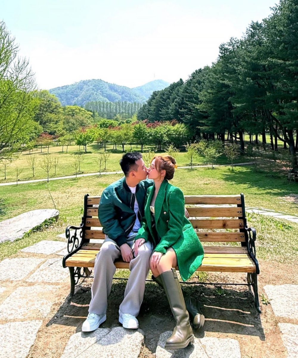 Giữa khung cảnh lãng mạn của đảo Nami, Huyền Baby và ông xã đã có khoảnh khắc "khóa môi" ngọt ngào. Bà mẹ hai con hóm hỉnh chia sẻ: "Lâu lâu cũng sến rện lắm, phải áo đôi mới chịu".