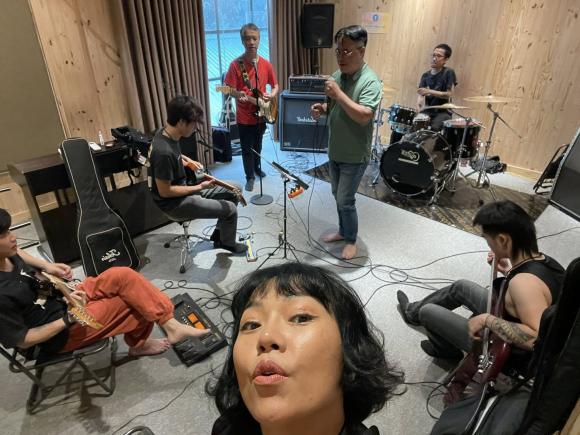 Thái Thuỳ Linh tập luyện cùng ban nhạc.