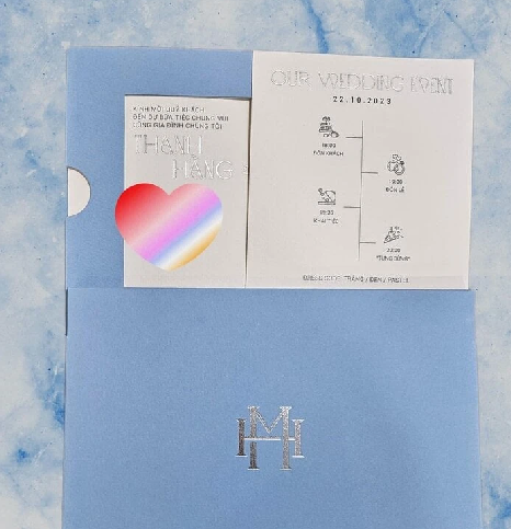 Thiệp cưới thanh lịch có tông màu xanh dương chủ đạo, lấy cảm hứng từ thời trang và âm nhạc với hình ảnh cặp đôi và phím đàn piano. Thiệp có chữ "H" và "M" (tên viết tắt của cô dâu, chú rể) đan xen.