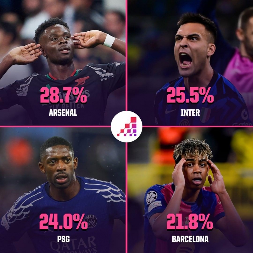 Dẫu vậy, con số kể trên vẫn xếp sau Inter Milan, đội được đánh giá có 25% cơ hội vô địch. Sau khi đánh bại Bayern Munich thuyết phục ở tứ kết, đoàn quân của HLV Simone Inzaghi sẽ đối đầu với đội bóng nhiều bàn nhất mùa này Barcelona tại vòng bốn đội mạnh nhất.
