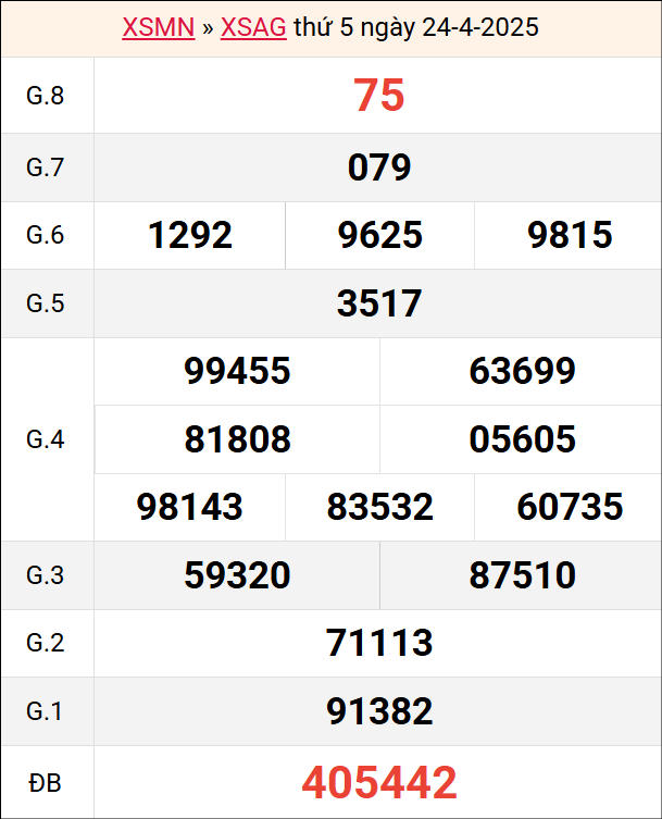 Mời các bạn xem lại bảng kết quả kỳ trước với giải đặc biệt, giải tám, lô tô 2 số để có thể đưa ra nhận định dự đoán AG ngày 1 tháng 5 năm 2025 chuẩn xác nhất.