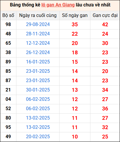 Bảng thống kê lô gan An Giang lâu về nhất 8/5/2025