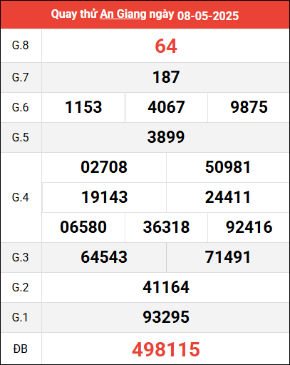 Mời các bạn xem lại bảng kết quả kỳ trước với giải đặc biệt, giải tám, lô tô 2 số để có thể đưa ra nhận định dự đoán AG ngày 8 tháng 5 năm 2025 chuẩn xác nhất.