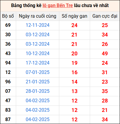 Bảng thống kê lô gan Bến Tre lâu về nhất 6/5/2025