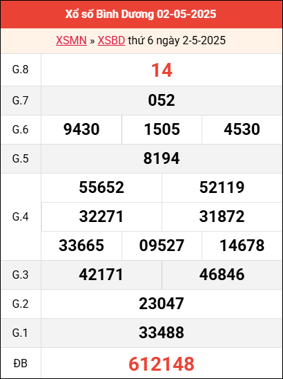 Mời các bạn xem lại bảng kết quả kỳ trước với giải đặc biệt, giải tám, lô tô 2 số để có thể đưa ra nhận định dự đoán BD ngày 9 tháng 5 năm 2025 chuẩn xác nhất.