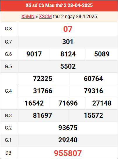 Bảng kết quả Cà Mau ngày 28/4/2025 tuần trước