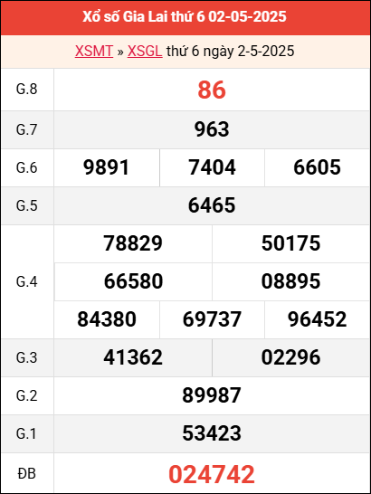 Mời các bạn xem lại bảng kết quả kỳ trước với giải đặc biệt, giải tám, lô tô 2 số để có thể đưa ra nhận định dự đoán GL ngày 9 tháng 5 năm 2025 chuẩn xác nhất.