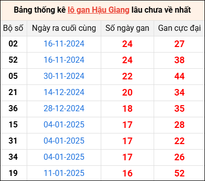 Bảng thống kê lô gan Hậu Giang lâu về nhất 10/5/2025