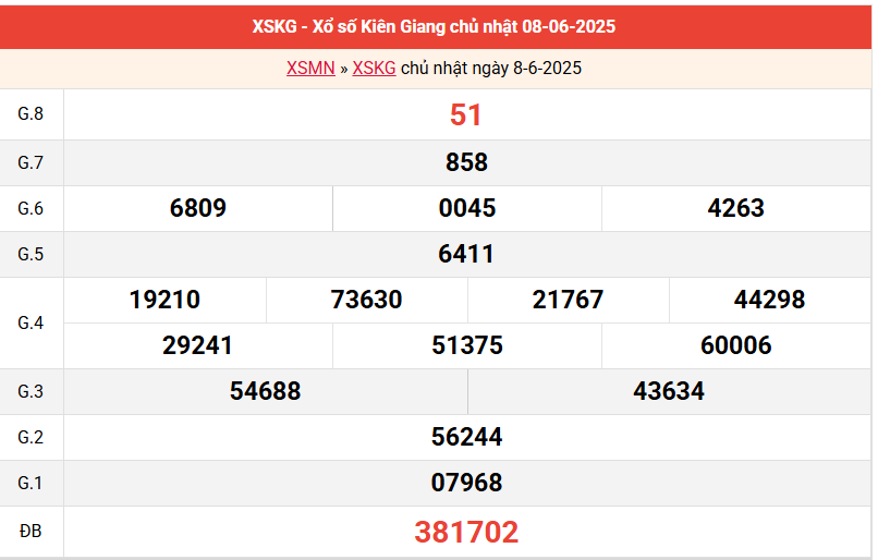 Kết quả xổ số Kiên Giang ngày 8/6/2025