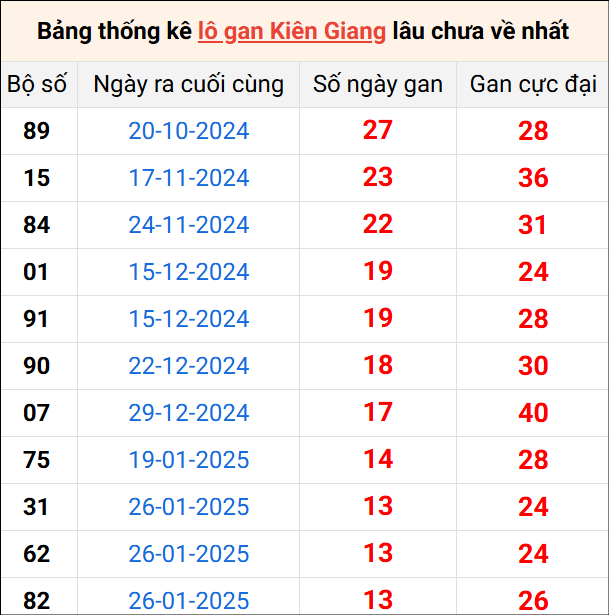 Bảng thống kê lô gan Kiên Giang lâu về nhất 4/5/2025