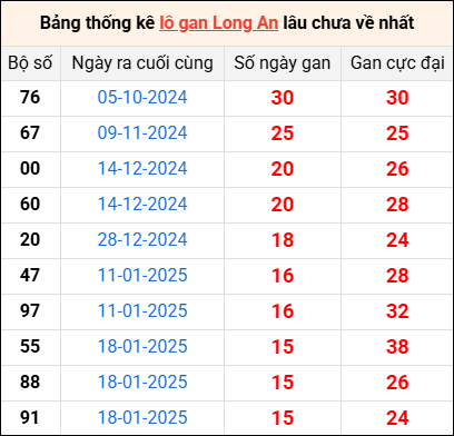 Bảng thống kê lô gan Long An lâu về nhất 10/5/2025