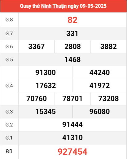 Mời các bạn xem lại bảng kết quả kỳ trước với giải đặc biệt, giải tám, lô tô 2 số để có thể đưa ra nhận định dự đoán NT ngày 9 tháng 5 năm 2025 chuẩn xác nhất.