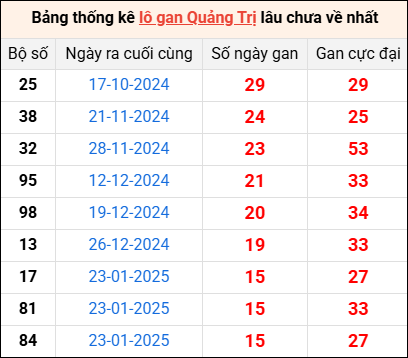 Bảng thống kê lô gan Quảng Trị lâu về nhất 15/5/2025