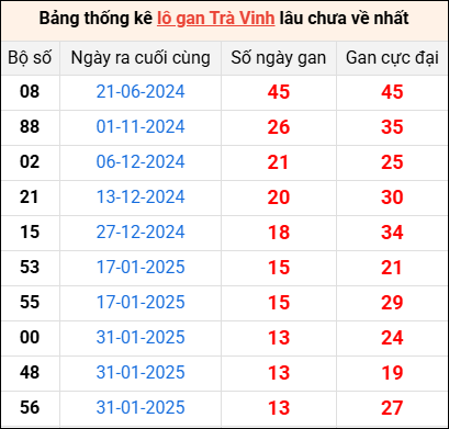 Bảng thống kê lô gan Trà Vinh lâu về nhất 9/5/2025