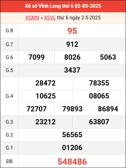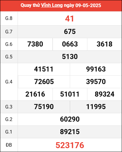 Mời các bạn xem lại bảng kết quả kỳ trước với giải đặc biệt, giải tám, lô tô 2 số để có thể đưa ra nhận định dự đoán VL ngày 9 tháng 5 năm 2025 chuẩn xác nhất.