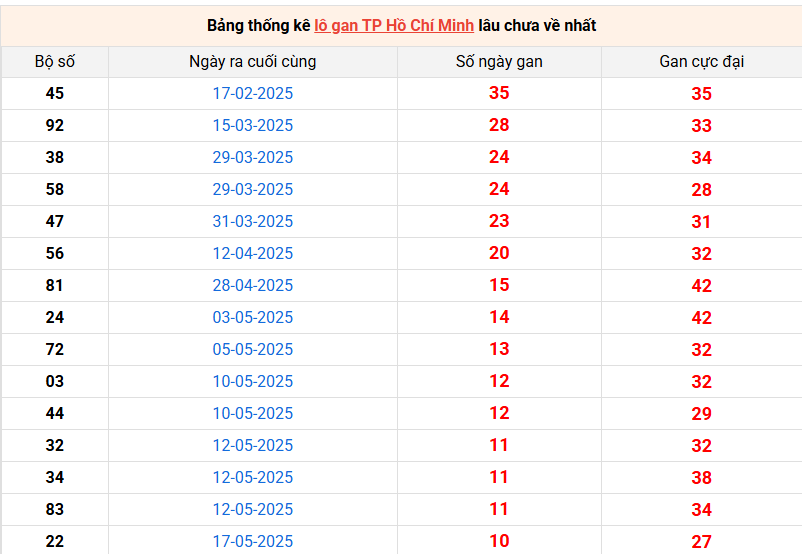 Bảng thống kê lô gan XSTP lâu về nhất 23/6/2025