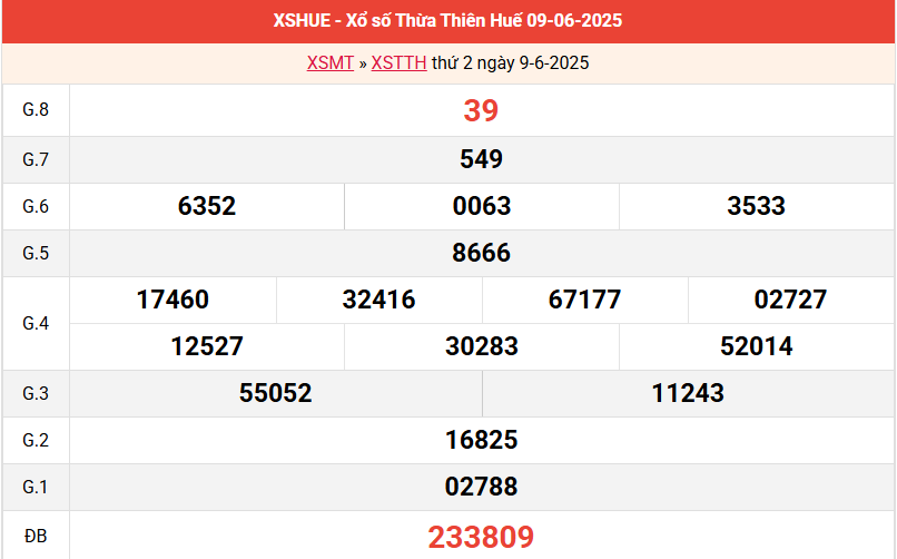 Kết quả xổ số Thừa Thiên Huế ngày 9/6/2025