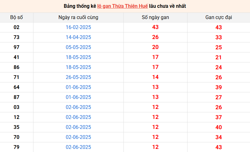Bảng thống kê lô gan Huế lâu về nhất 21/7/2025
