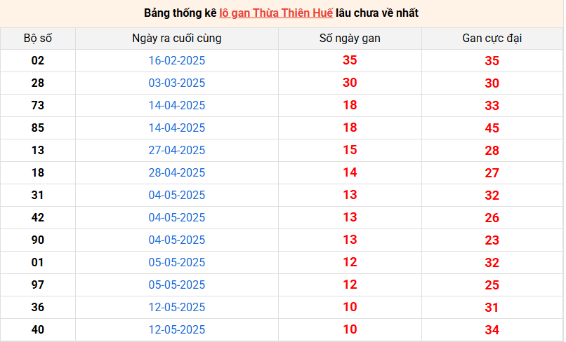 Bảng thống kê lô gan Huế lâu về nhất 23/6/2025